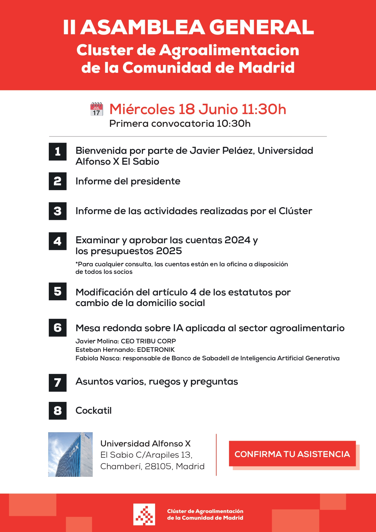El próximo miércoles 18 de junio celebraremos un evento clave para el presente y el futuro del sector agroalimentario en nuestra región: la II Asamblea General del Clúster de Agroalimentación de la Comunidad de Madrid. La cita tendrá lugar en la Universidad Alfonso X El Sabio, en C/ Arapiles 13 (Madrid), a partir de las 11:30h (primera convocatoria a las 10:30h).